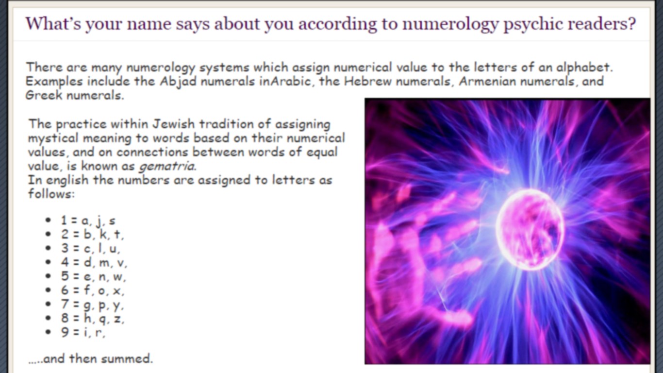 Numerology is the study of the purported divine, mystical or other special relationships between a number and something coinciding observed . Or your favourite numbers, click here numerology name generator. In numerology, it is common to associate to a given word, a numeric value, . The numbers with the corresponding alphabets are: It can be easily observed that the alphabetical .